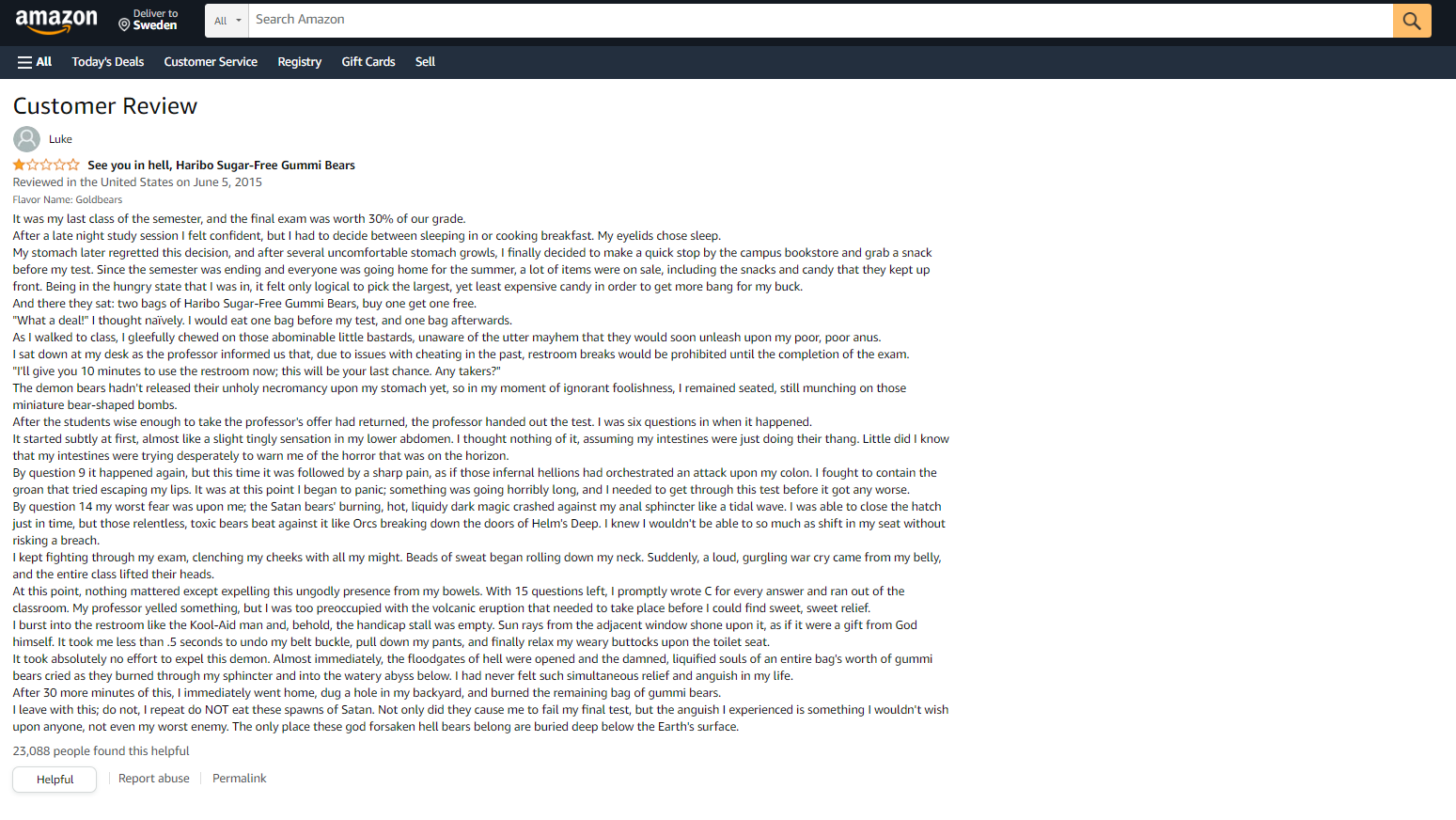 I am yet to read something funnier than the review of Haribo Sugar Free Gummy Bears on Amazon.